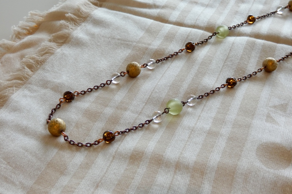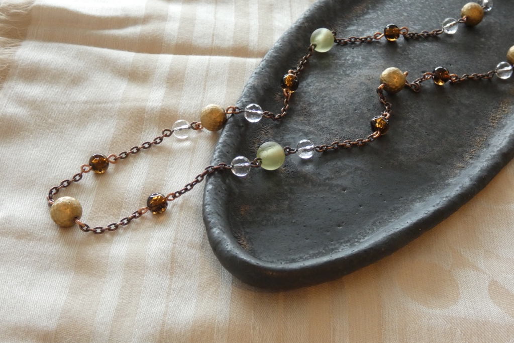 Variety of Vintage and Quartz Beads & Textured Copper Chain Long Necklace